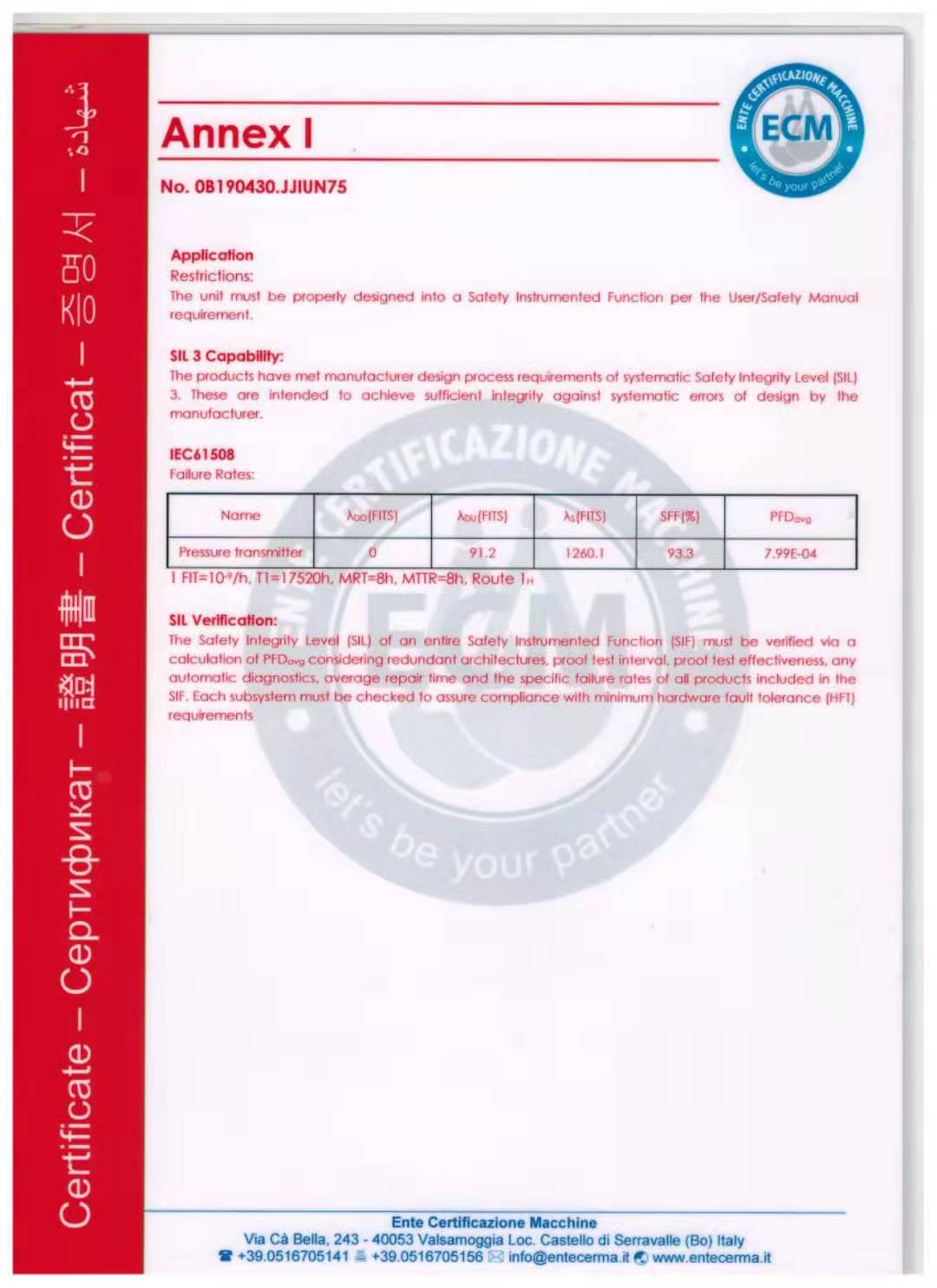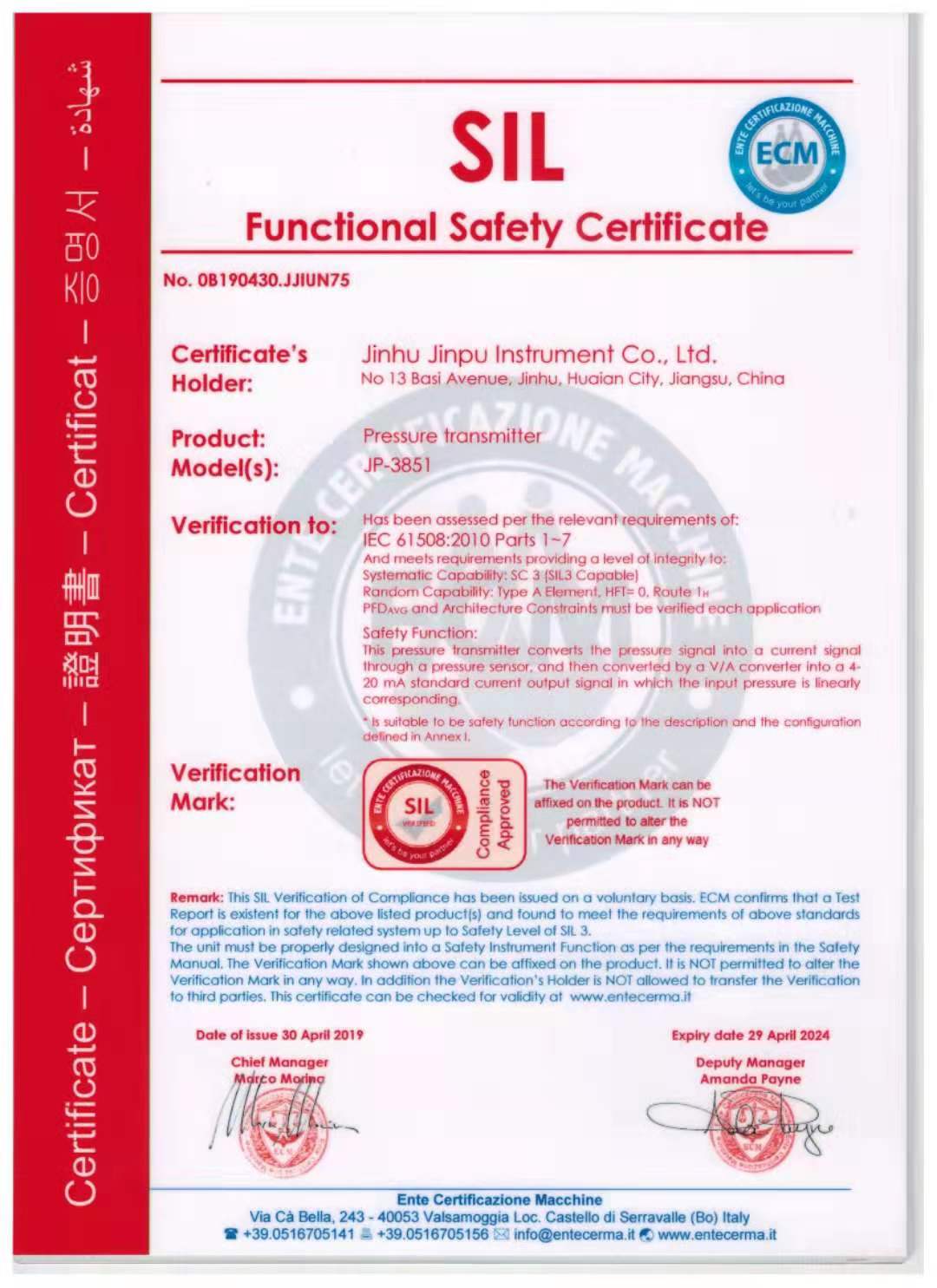 以下图片为金湖金普仪表获得的SIL2认证,该证书证明了变送器质量优秀,获得广大用户认可。